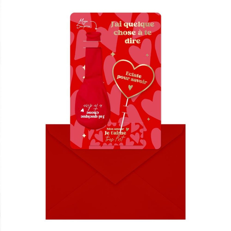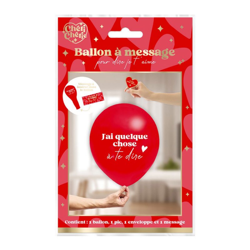 Contient un ballon "J'ai quelque chose à te dire", une carte "Je t'aime à la folie", une enveloppe et un pic "éclate pour savoir".