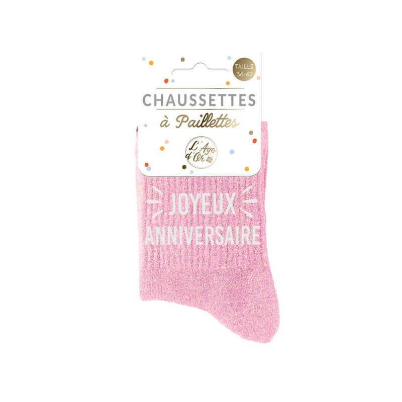 Chaussettes paillettes colorées Joyeux Anniversaire.