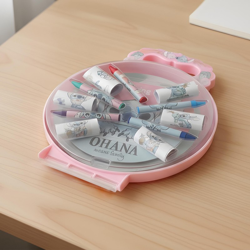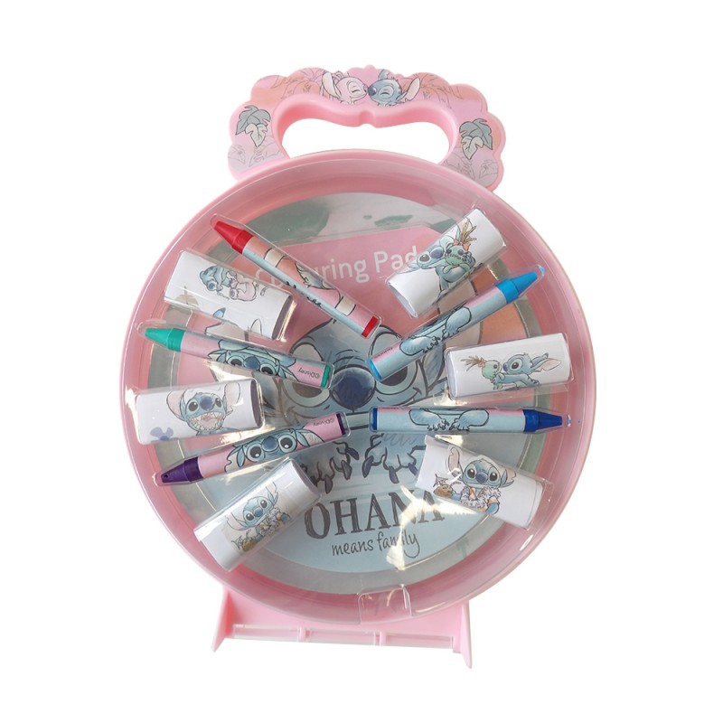 Set de coloriage et stickers Stitch & Angel Disney avec 5 crayons de cire, 2 dessins à colorier et 6 planches de stickers.