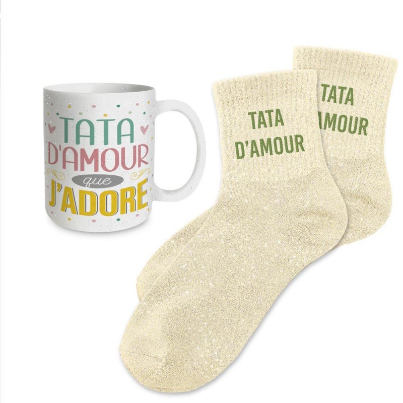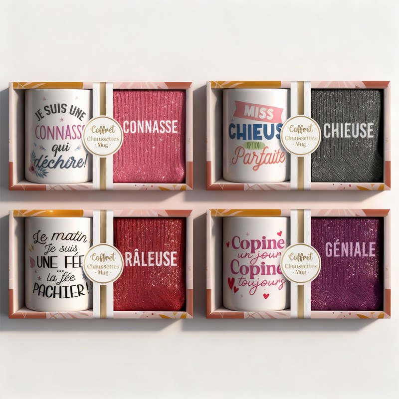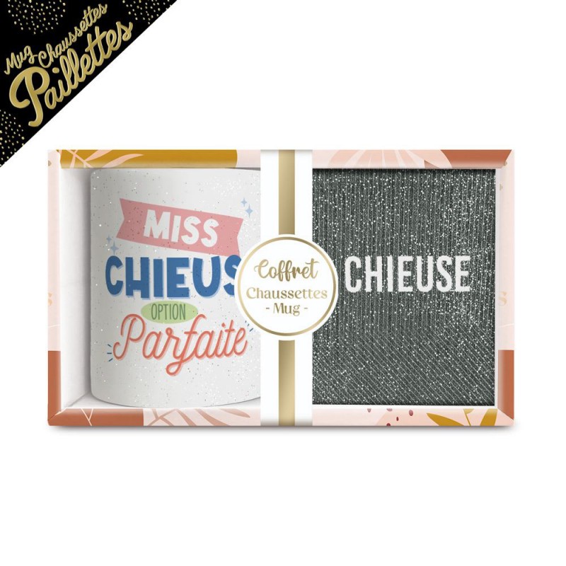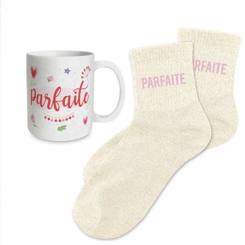 Coffret avec mug coloré à paillettes en céramique et chaussettes paillettes assorties.