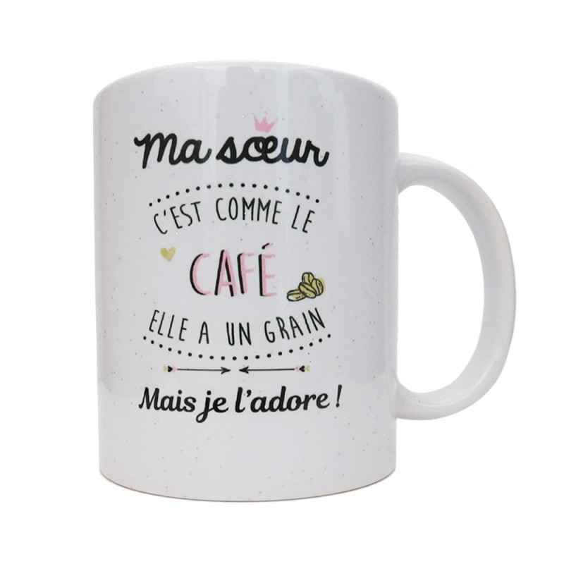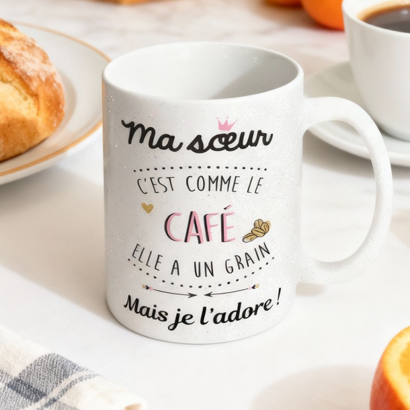 Mug à paillettes « Ma sœur, c’est comme le café, elle a un grain, mais je l’adore ! ».