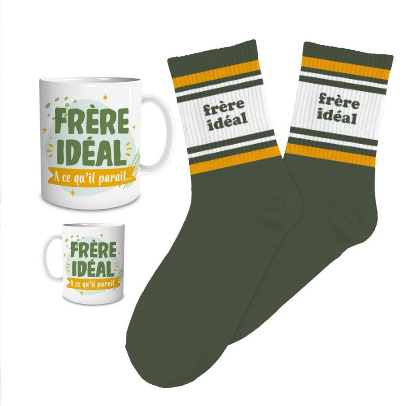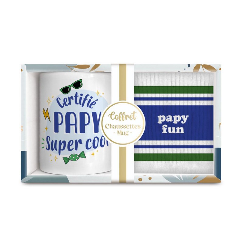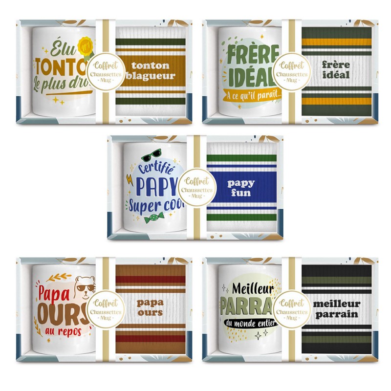 Coffret famille fantaisie homme avec mug en céramique et chaussettes assorties.